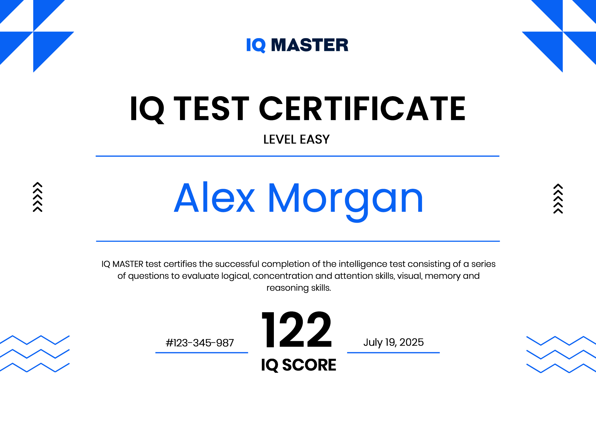 IQ Master is an IQ test and you can complete it in a few minutes by answering questions about logic, concentration, attention, memory and more. At the end of the test you will be able to know your results, your level compared to other users and get your printable certificate. Learn more about IQ test.